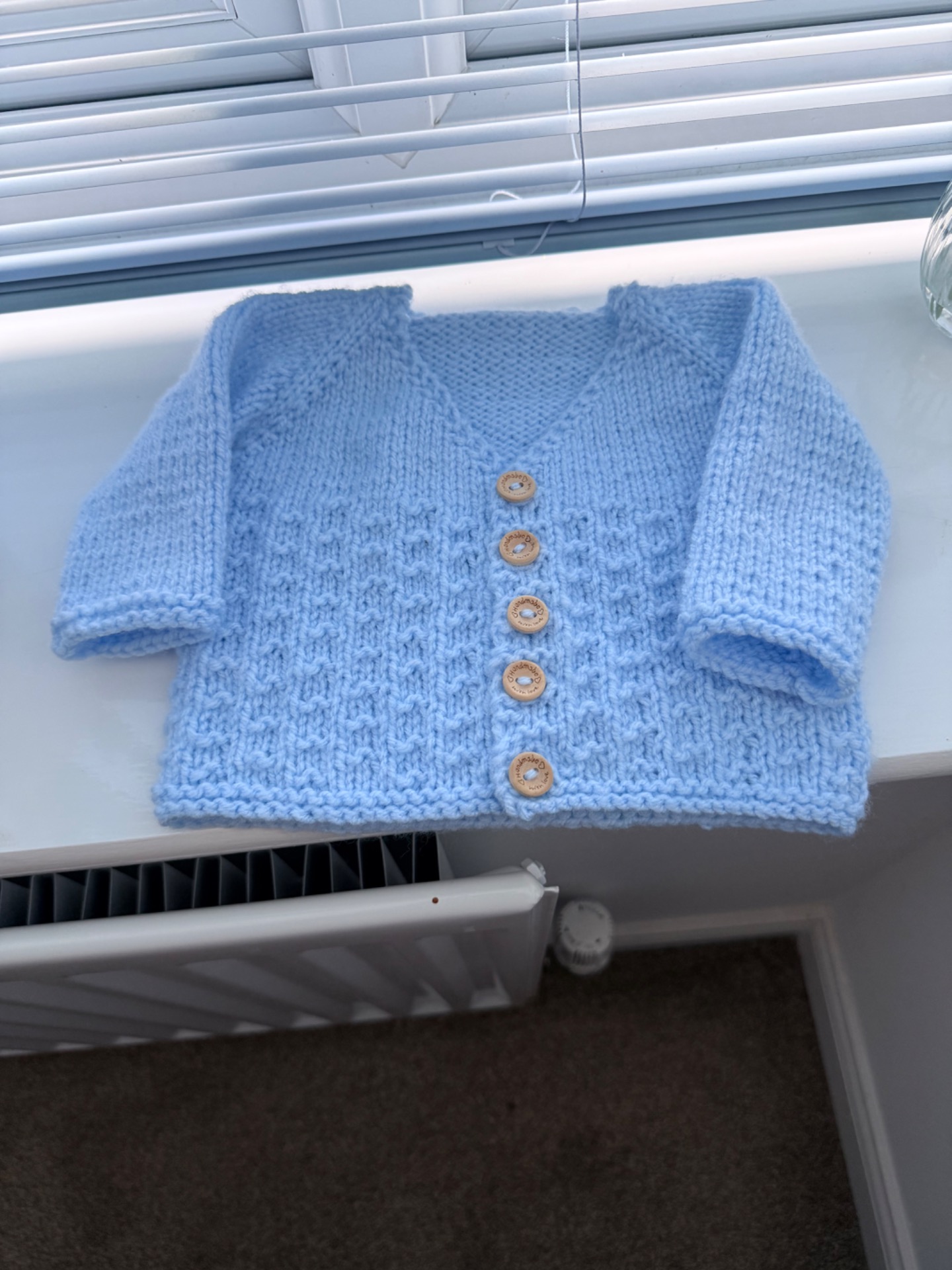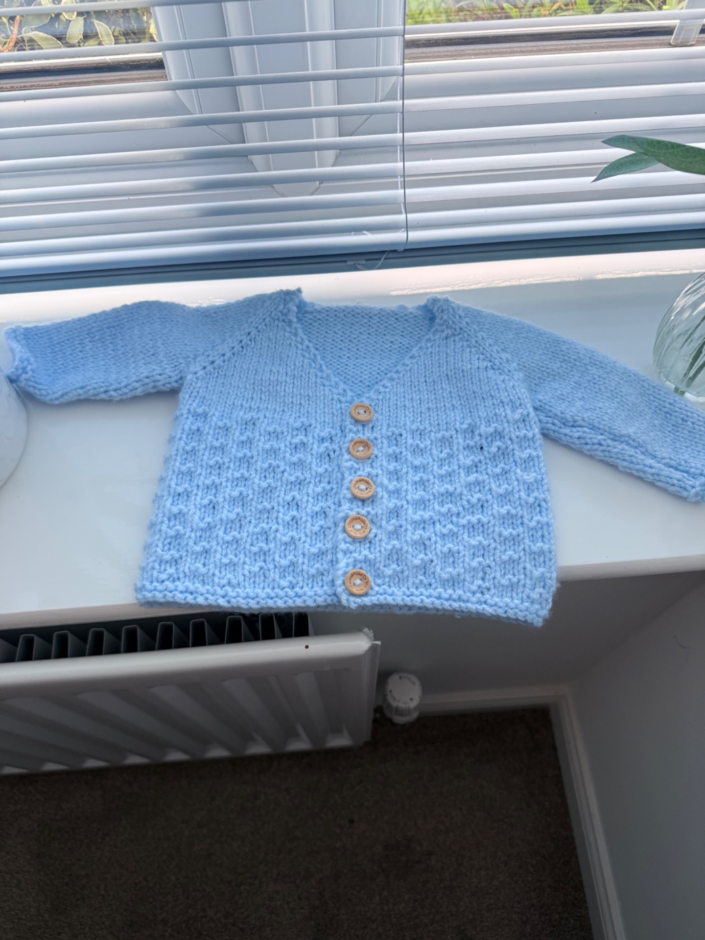 hand knitted cardigan in blue 0-3 months button closure. long sleeves