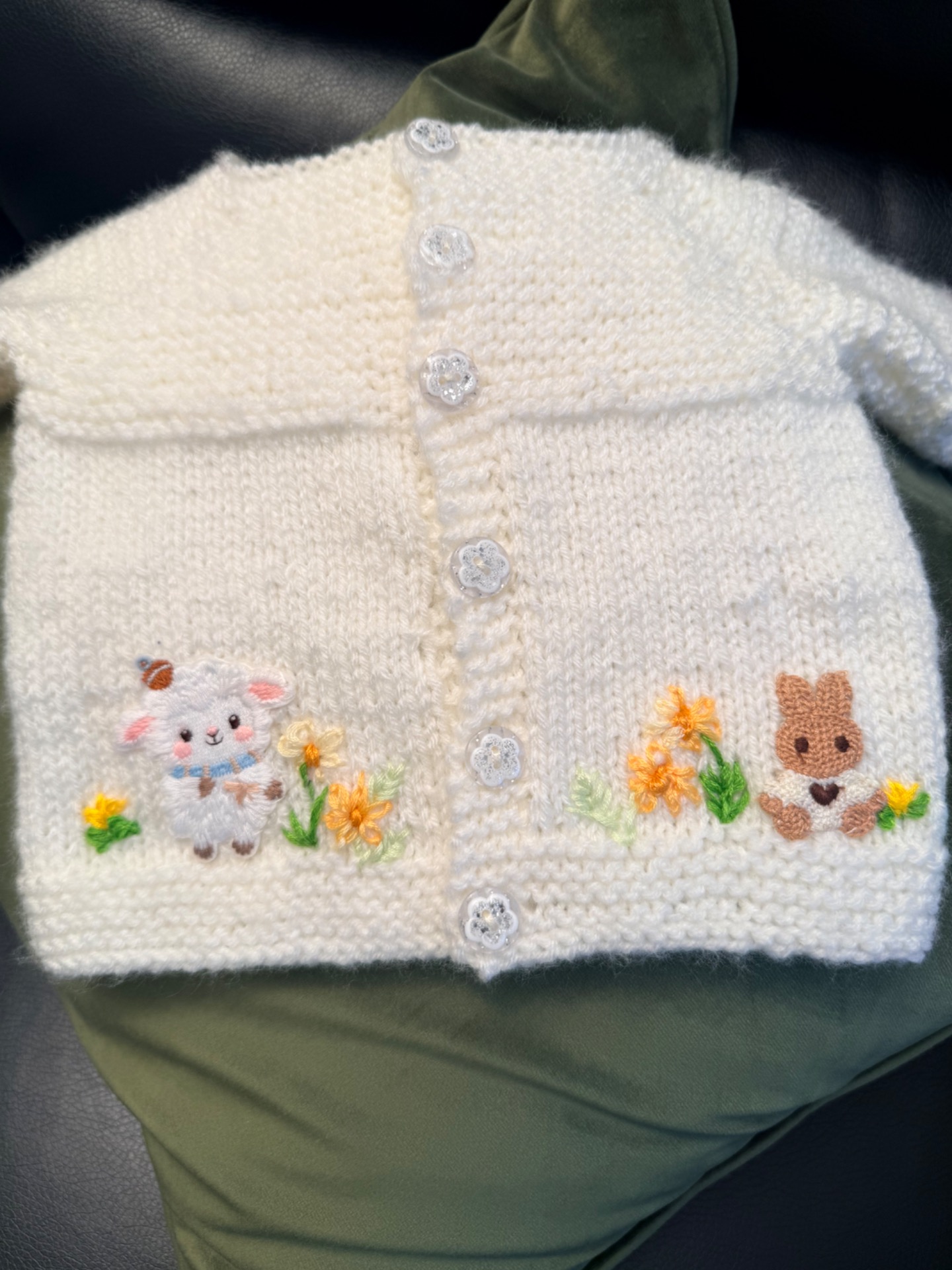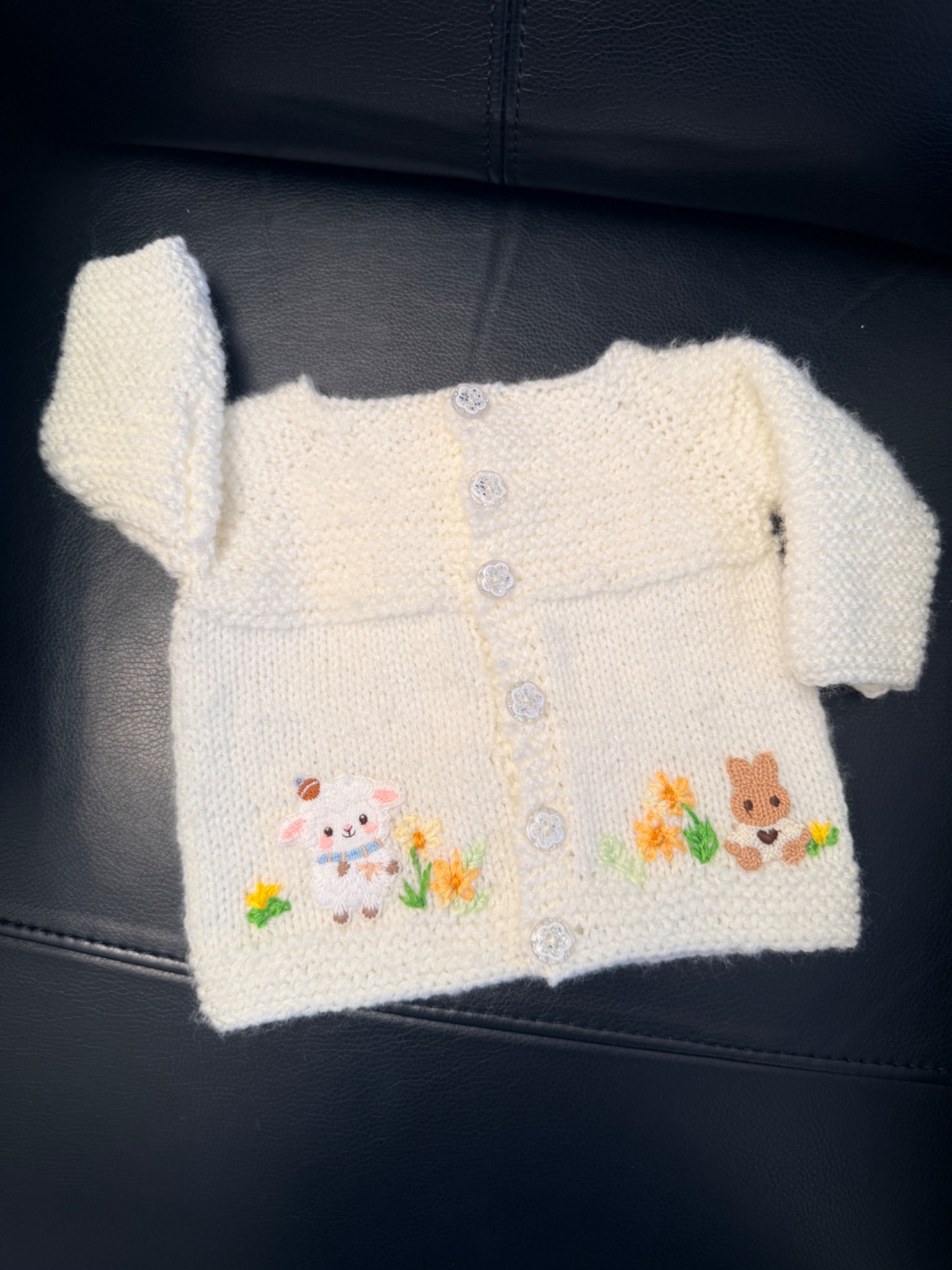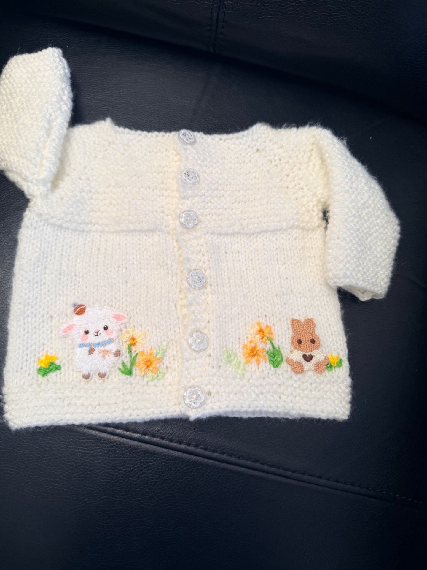 An Easter cardigan hand knitted with lamb and rabbit among spring coloured embroidered flowers fir new born baby