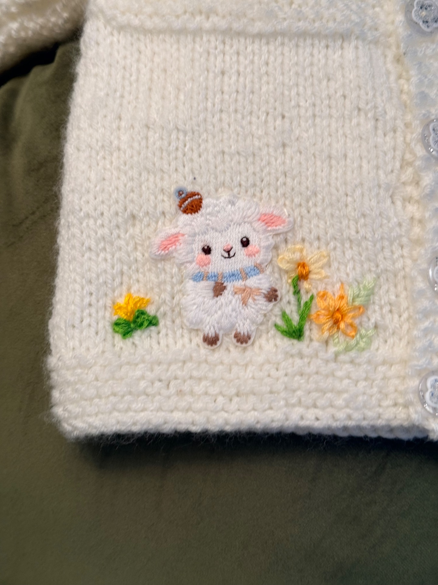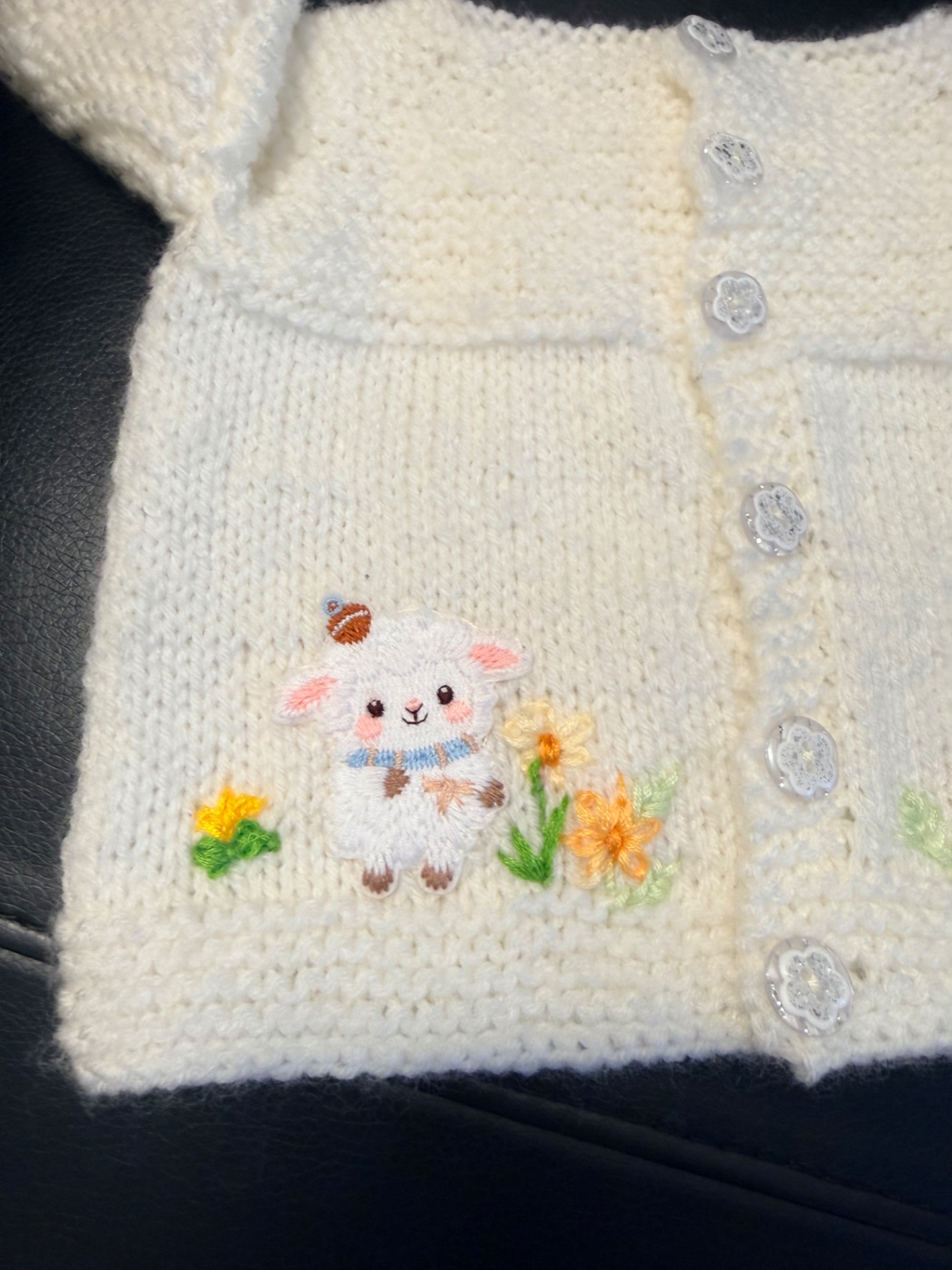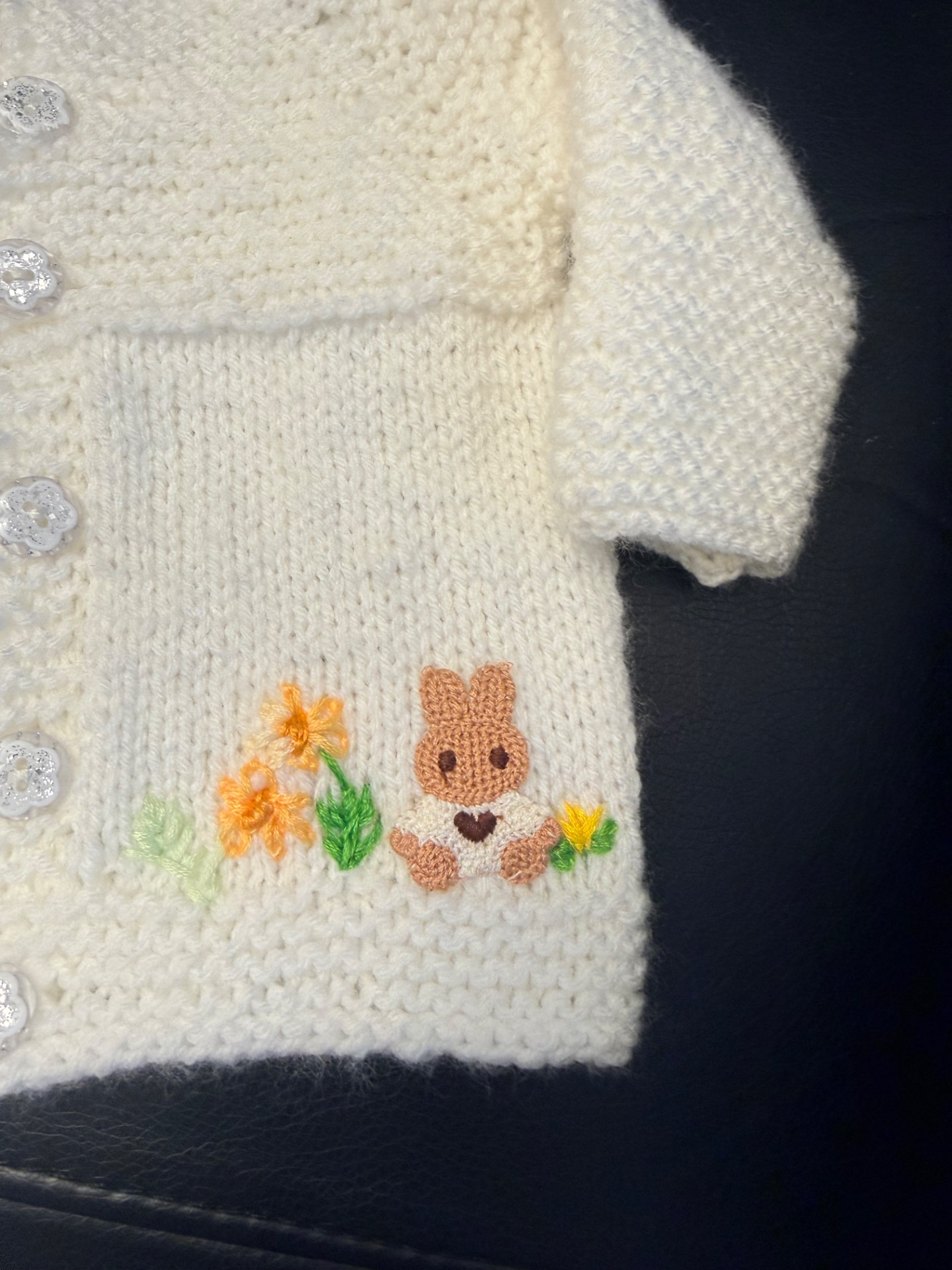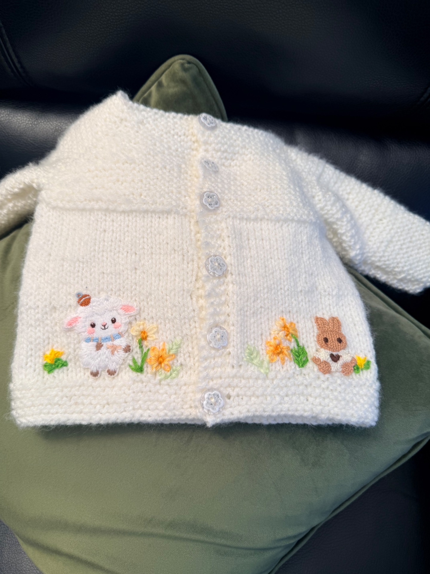 An Easter cardigan hand knitted with lamb and rabbit among spring coloured embroidered flowers fir new born baby