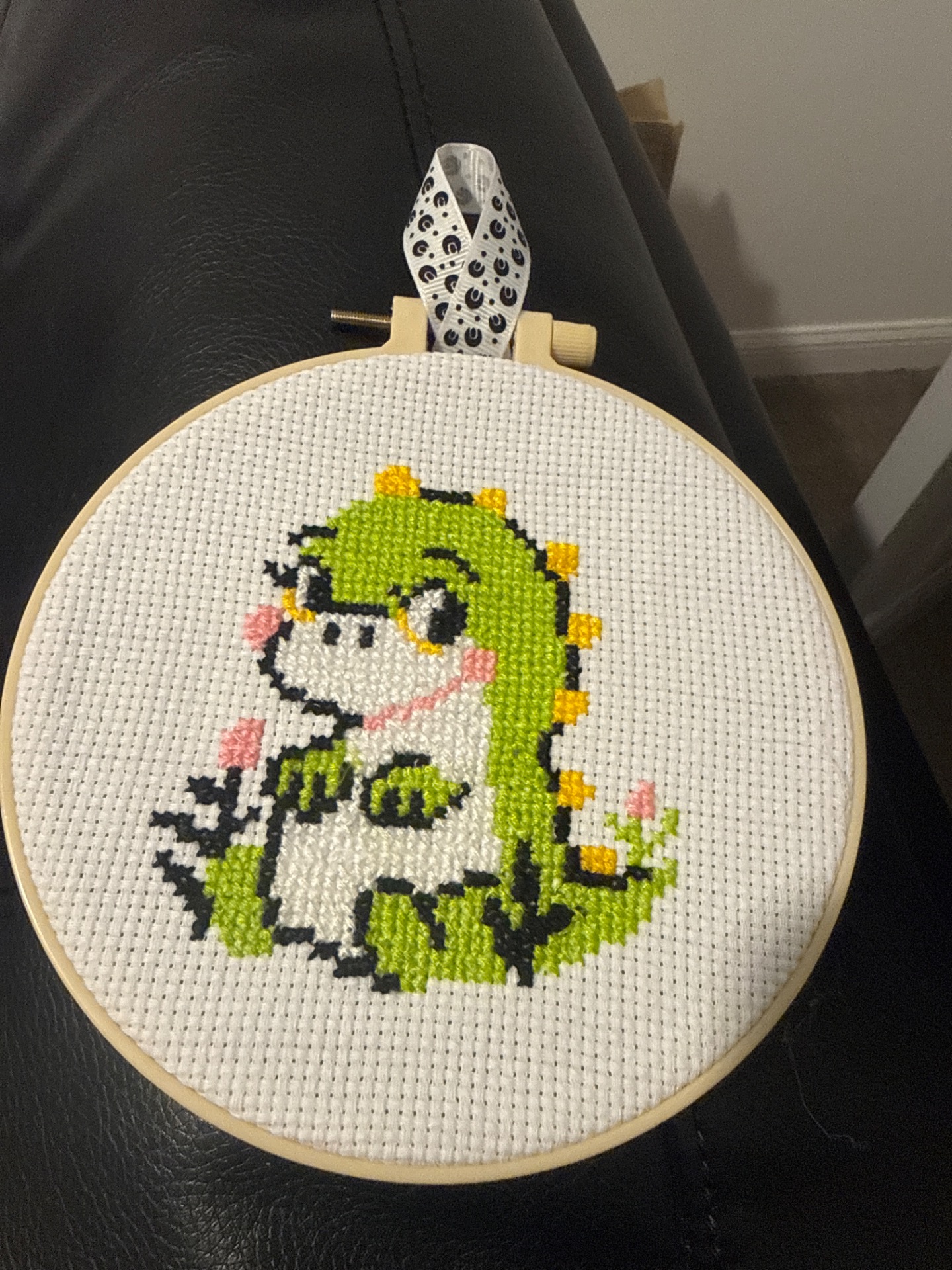 finished cross stitch wall hanging of a green baby dragon in a 6” hoop