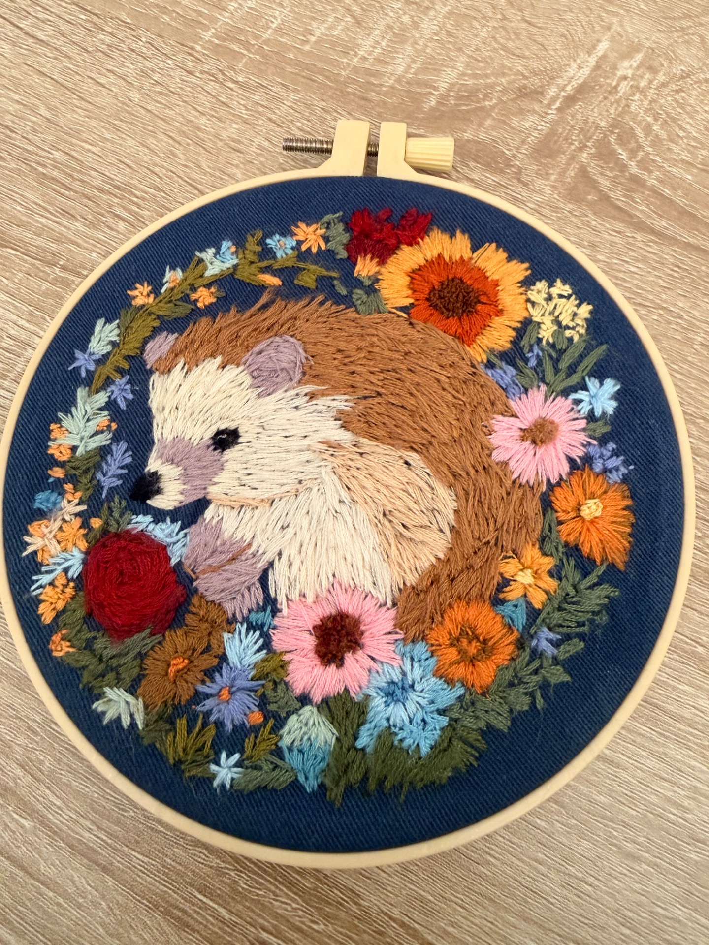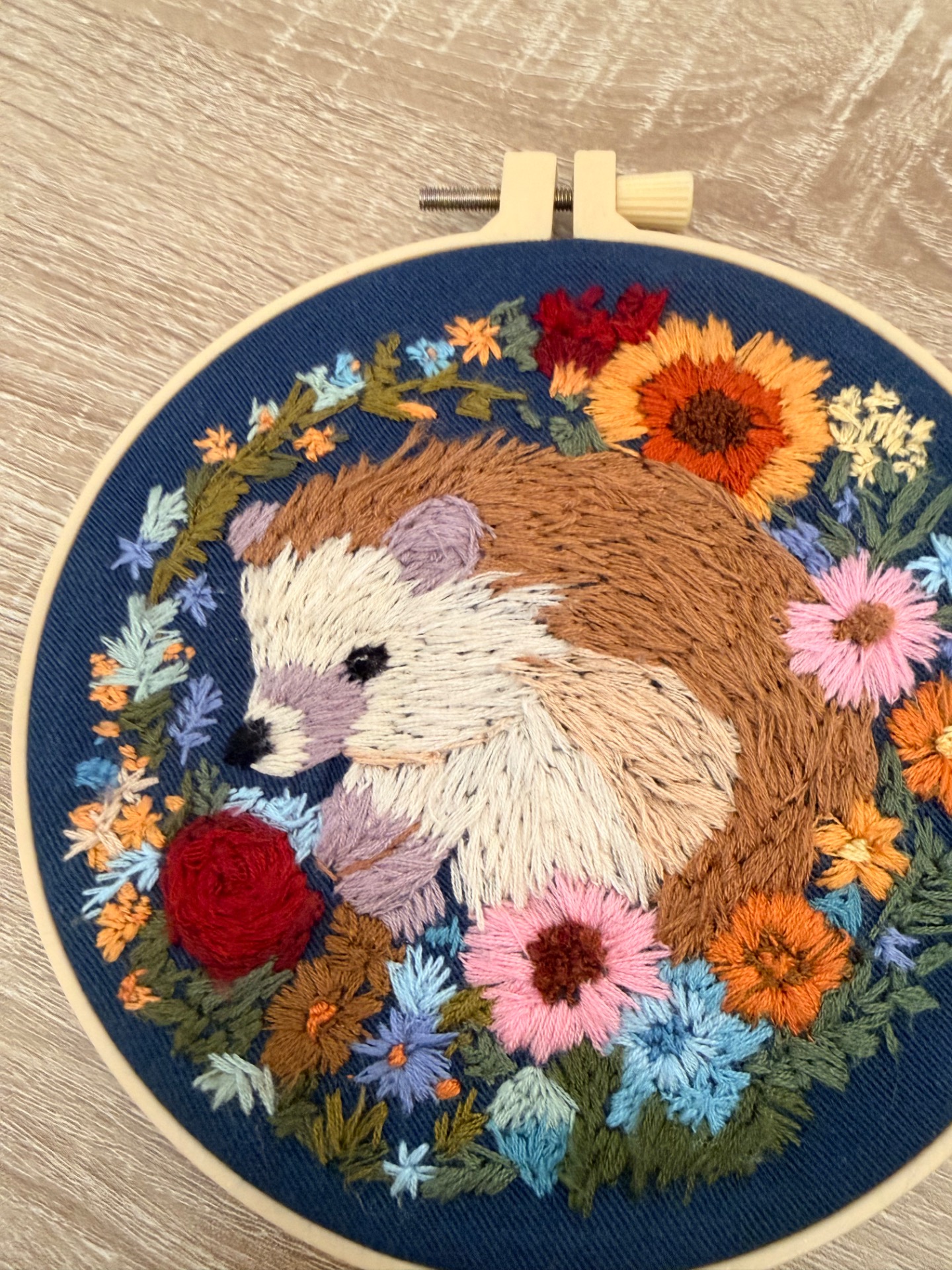 a beautiful finished embroidery of a hedgehog amonst flowers on navy linen in a 6” hoop backed with felt .
